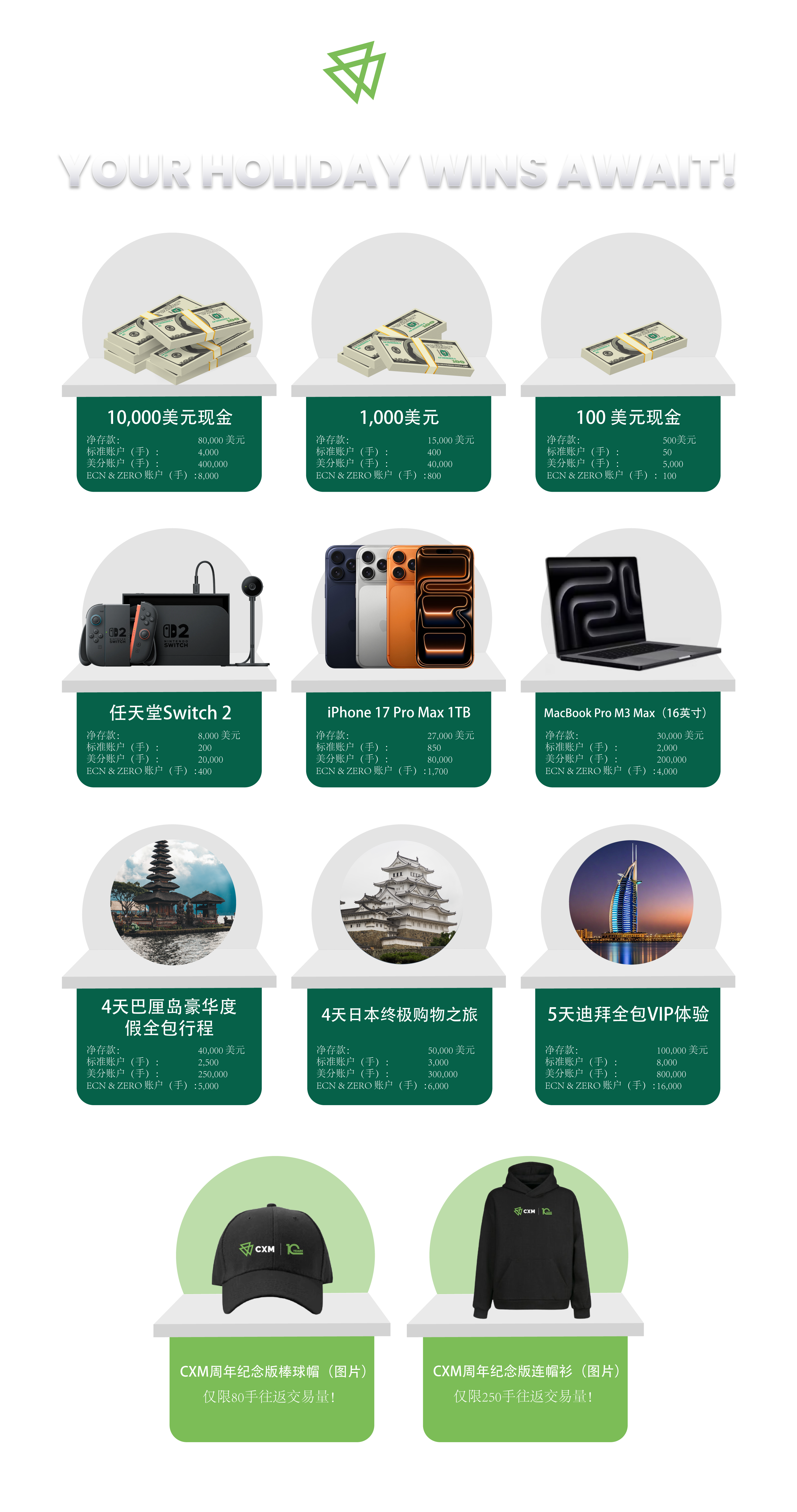 加入CXM的“欢乐交易·节日赢大奖”活动,只需在官方促销页面填写并提交注册表单。每笔交易都将让您更接近激动人心的节日大奖——交易越多,这个节日季您能拆开的惊喜就越多!